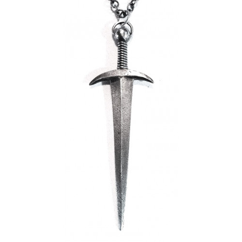 Hängsmycke i form av ett svärd i solitt sterling silver. Svärdet är ca 70 mm långt och 22 mm brett med en största tjocklek på ca 5 mm. Till smycket hör en ca 52 cm lång, svart halsrem i läder med bajonettlås i rostfritt stål.