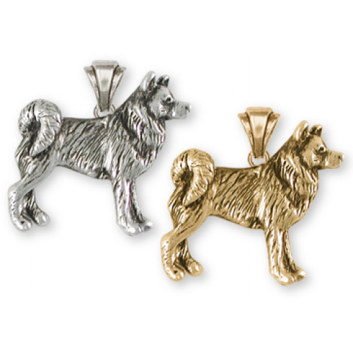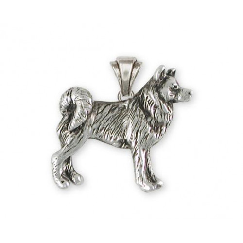 Stående Alaskan Malamute nr MAL02 som hängsmycke med vackert skulpterad ögla kan du beställa tillverkad i sterling silver. Hunden är en ca 25 mm bred tredimensionell liten skulptur och den är mycket detaljrik.