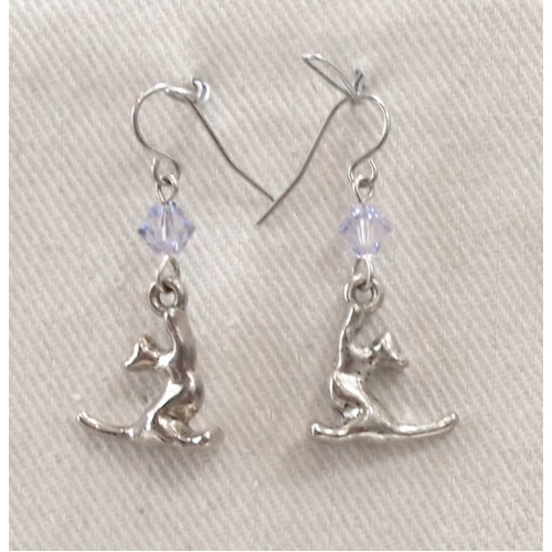 Örhängen i silverpläterat tenn med en smidig katt som leker med den dekorativa pärlan som är fäst ovanför katten. Kristallpärlan kommer från den kände tillverkaren Swarovski och är i den ljust lila färgen Provence Lavender.