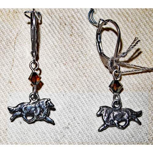 Örhängena med travande Shetland Sheepdog eller Collie i Kontur är ca 16 mm brett och 10 mm högt, och tillverkade i sterling silver. Örhängena är för hål i öronen och de har krokar med fällöglor i allergivänligt kirurgstål.