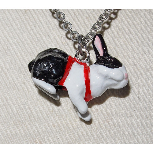 Handmålat hängsmycke i tenn i form av en sittande kanin i sele. Kaninen är målad som rysstecknad i svart och vitt med röd sele. Hänget är ca 25 mm brett och 20 mm högt.