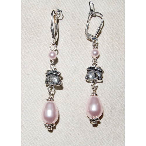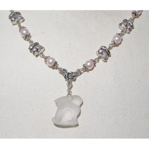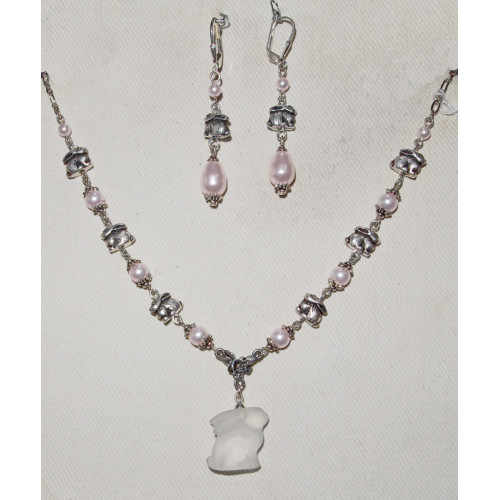 Ett smyckeset med kanin pärlor gjorda i silveroxiderat tenn och där alla pärlor är Swarovskipärlor i färgen Rosaline Kaninerna är ca 10 mm breda och 10 mm höga. Längst ned på halsbandet hänger en magnifik kanin i frostat glas från Swarovski i bredd ca 15 mm, höjd ca 20 mm och tjocklek ca 10 mm.