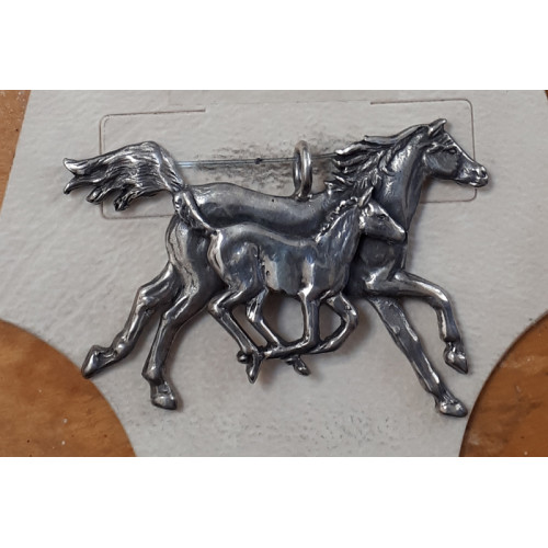 Hänget Sto med Föl är ett smycke för dig som tycker om hästar och föreställer ett sto med sitt föl i galopp. Det här smycket är tillverkat helt i sterling silver och är ca 38 mm brett och 26 mm högt. Det här är ett hängsmycke med en fastlödd ringögla för enkel användning på en halskedja.